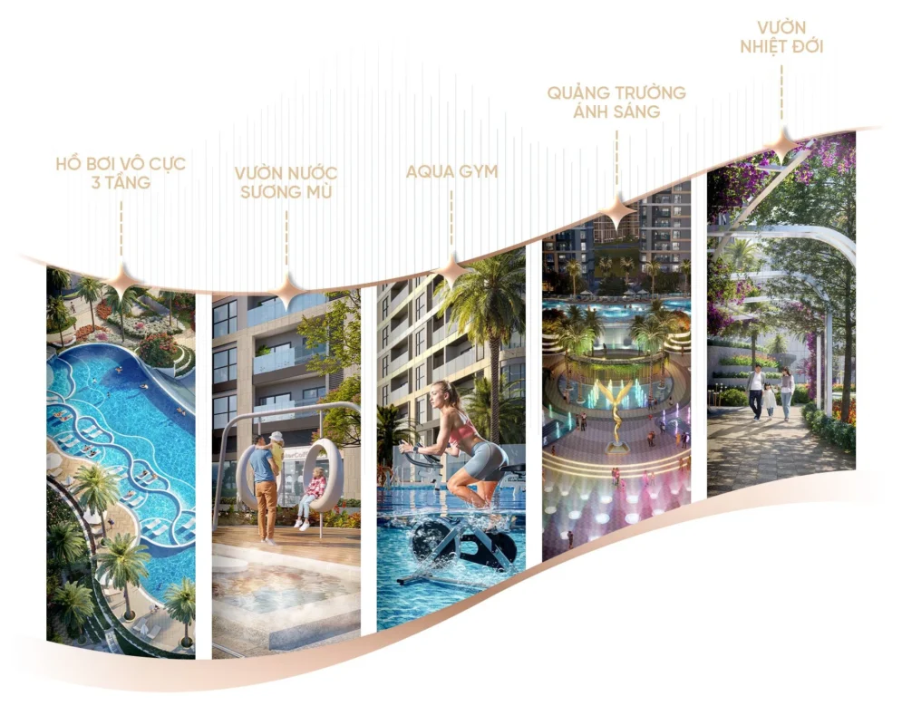 - Công viên phong cách resort: Tích hợp các tiện ích nghỉ dưỡng như thác tràn, aqua gym, sân khấu nhạc nước, rạp phim ngoài trời, quảng trường ánh sáng, vườn sương mù và vườn treo nhiệt đới.