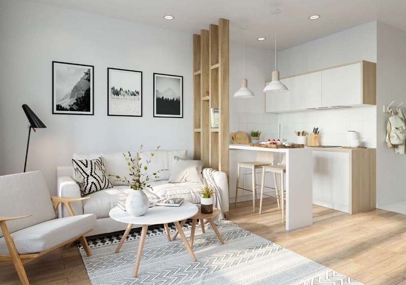 Không gian mở là giải pháp hiệu quả để căn hộ nhỏ trông rộng rãi và liền mạch hơn. Việc kết nối phòng khách với bếp giúp mở rộng tầm nhìn và tăng diện tích sinh hoạt chung.