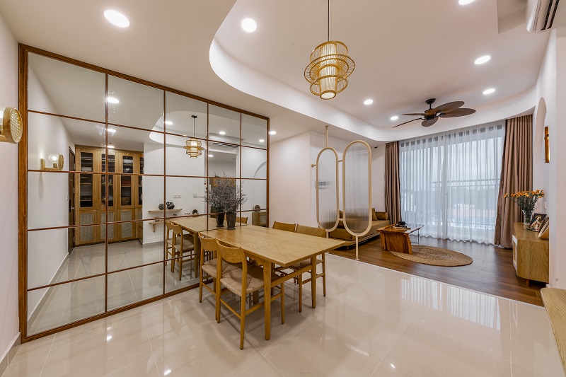 Trong thiết kế căn hộ phong cách Nhật Bản, gỗ là vật liệu chủ đạo và xuất hiện xuyên suốt không gian. Bên cạnh đó, chúng còn có tác động tích cực đến tinh thần, giúp giảm căng thẳng và tạo sự thư giãn. Đây cũng là yếu tố giúp không gian giữ được vẻ đẹp bền vững theo thời gian.