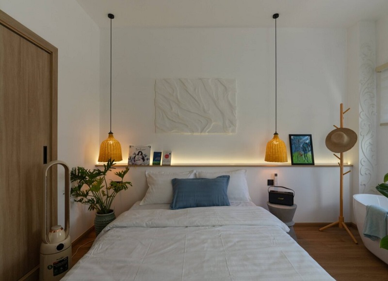 - Đèn thả mây tre hai bên giường mang đến cảm giác ấm áp, lãng mạn.