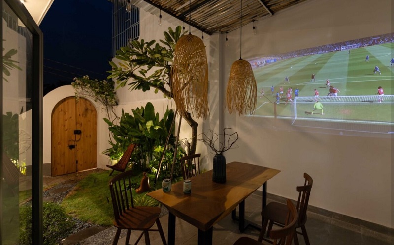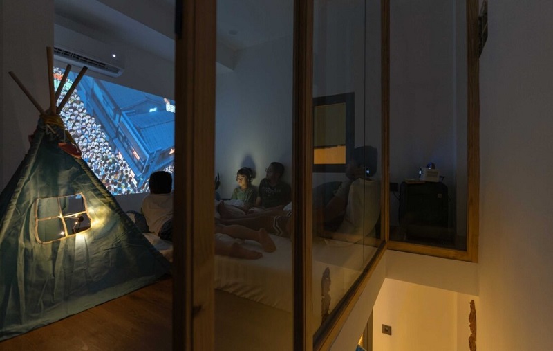 Một máy chiếu nhỏ được lắp đặt đối diện giường, biến căn phòng thành rạp phim mini mỗi tối. Những đứa trẻ có thể nằm dài xem hoạt hình, còn bố mẹ thư giãn bên cạnh – khoảnh khắc ấm áp mà ngôi nhà này mang lại thật đáng quý.