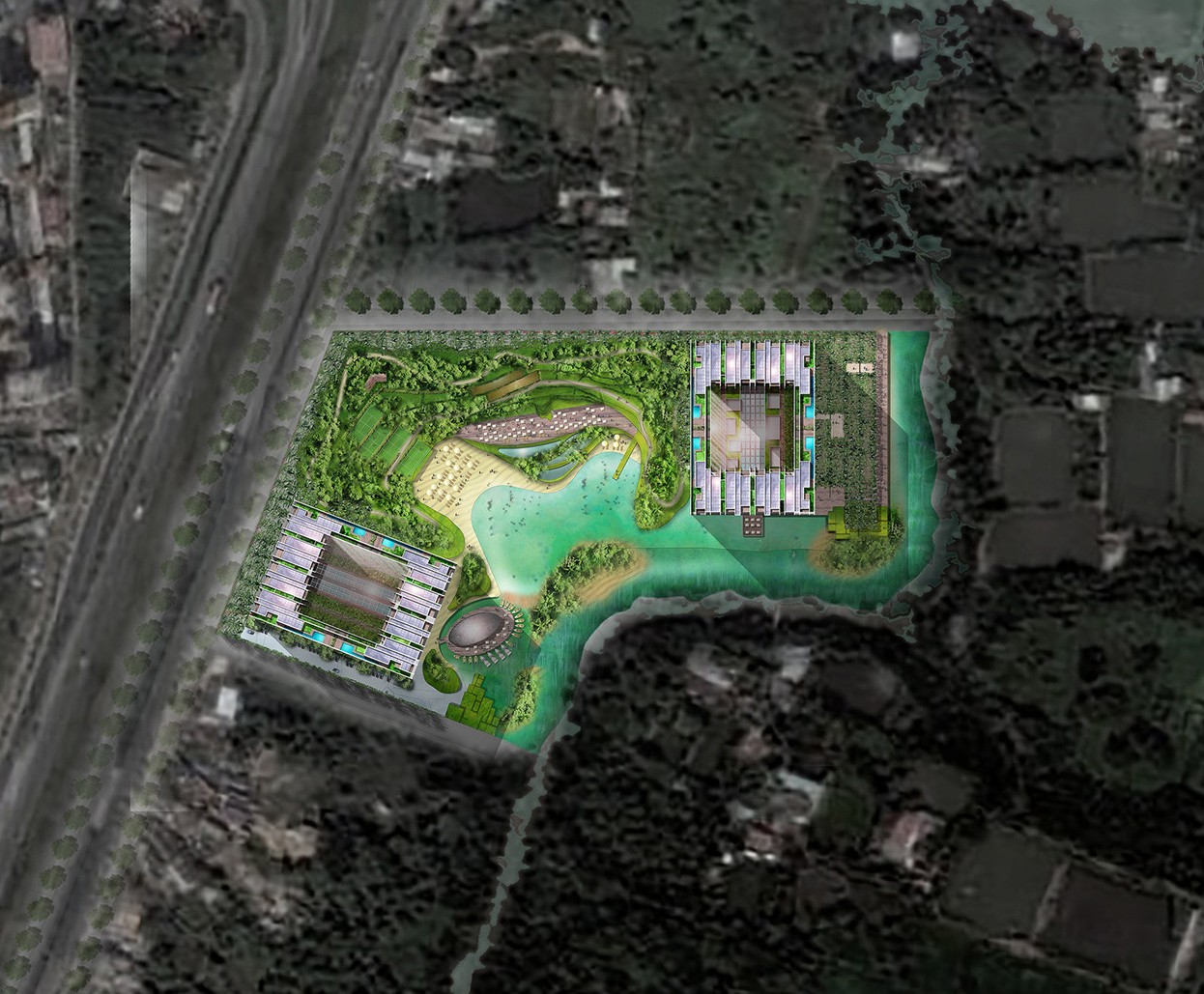 Tổng thể mặt bằng nhấn mạnh sự hài hòa giữa kiến trúc hiện đại và thiên nhiên, với vườn treo và mái vòm bê tông-kính đặc trưng, phản ánh triết lý sống gần gũi môi trường của Capitaland.