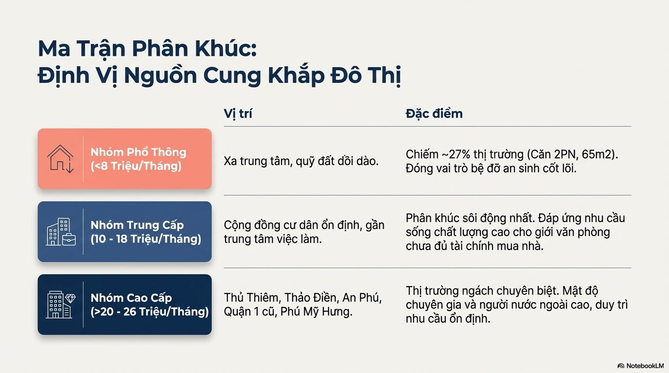 | Khu vực chuyên gia, cao cấp | Trên 26 triệu đồng/tháng | Tập trung người nước ngoài, chuyên gia, cộng đồng cư dân chất lượng |