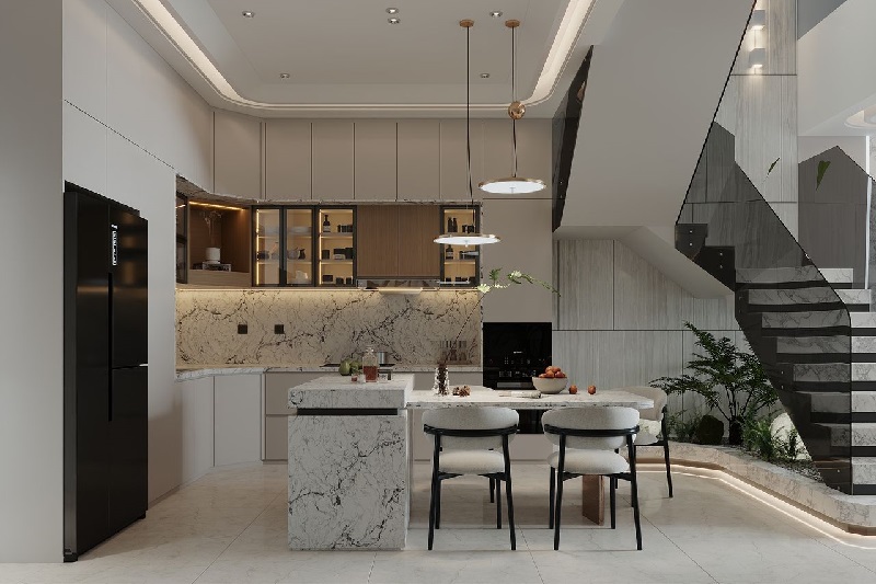Ngoài ra, việc kết hợp thêm các loại đèn trang trí như đèn thả tại bàn đảo hoặc khu vực bàn ăn sẽ giúp không gian bếp trở nên ấm cúng, gần gũi hơn, đồng thời tạo điểm nhấn thẩm mỹ cho tổng thể căn bếp.
