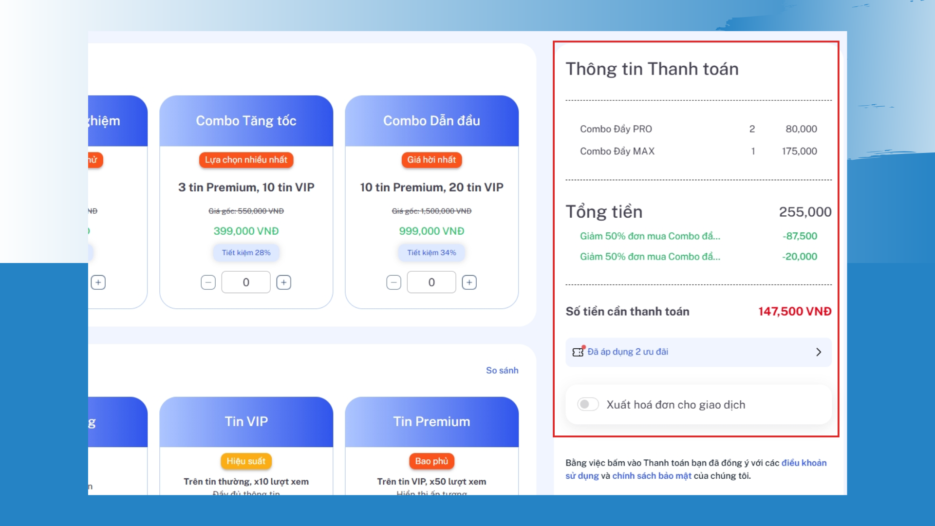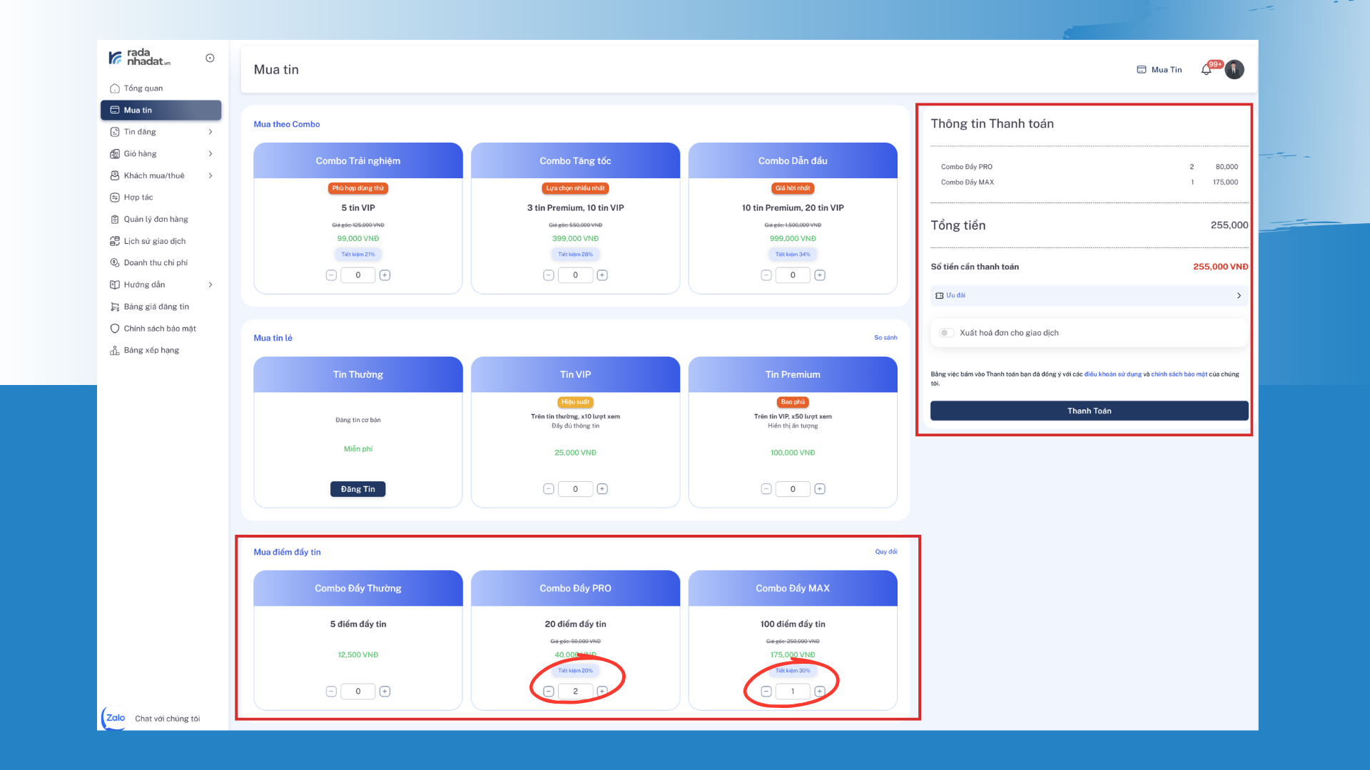 Trong giao diện mua hàng, chọn dịch vụ bạn muốn sử dụng (ví dụ: Combo Đẩy Tin, gói đăng tin…) và điều chỉnh số lượng bằng nút + / – nếu có.