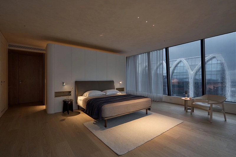Ánh sáng dịu nhẹ từ hệ đèn hắt trần kết hợp với view toàn cảnh thành phố qua cửa kính mang lại cảm giác thư giãn tuyệt đối. Điểm đặc biệt trong không gian này là sự “trống trải có chủ đích” – khoảng hở rộng rãi giúp gia chủ cảm thấy thoải mái, phù hợp với lối sống tinh giản vốn được đề cao trong toàn bộ căn hộ.