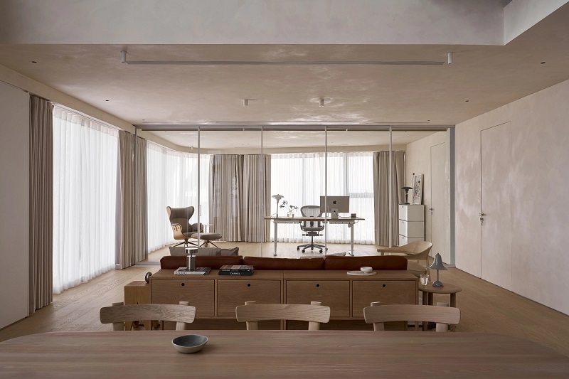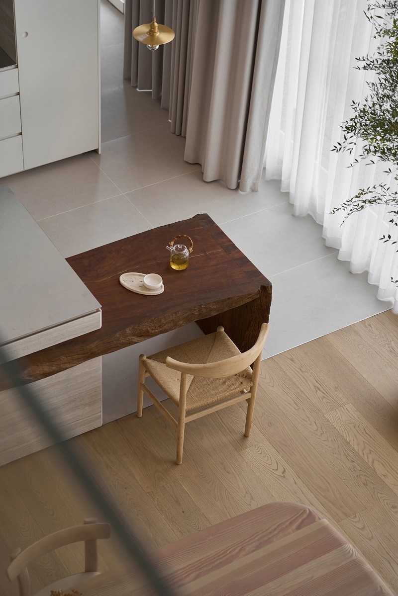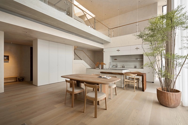 Một trong những điểm nhấn của căn hộ là kết cấu hai tầng với mặt sàn thông suốt giữa phòng khách, bếp và khu làm việc. Không gian mở giúp kết nối các thành viên trong gia đình, đồng thời tạo cảm giác thoáng rộng. Sự liền mạch còn được thể hiện qua cách sử dụng vật liệu và tông màu trung tính xuyên suốt toàn bộ căn nhà.