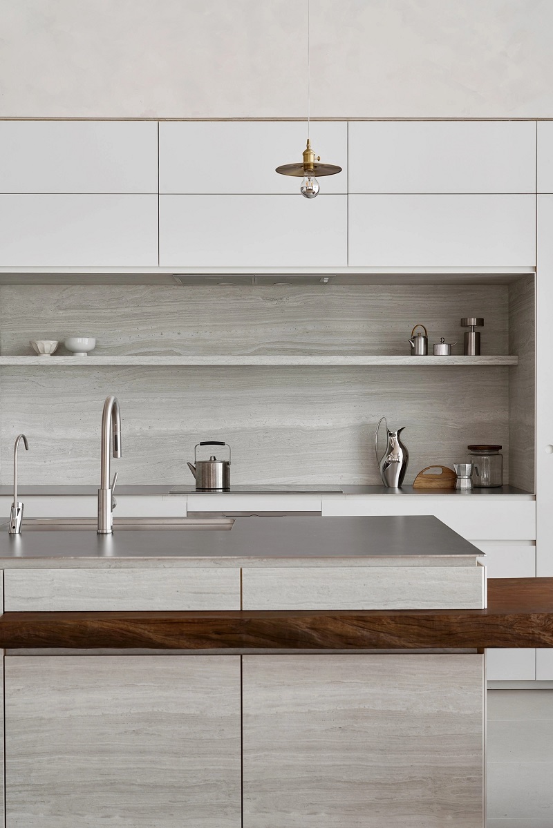 Hệ tủ bếp và đảo bếp được chế tác từ đá nung kết hợp cùng laminate chống bám vân tay, bề mặt inox chống xước dày 6mm. Inox không chỉ tạo sự hiện đại mà còn có khả năng chống khuẩn, dễ vệ sinh – một giải pháp bền vững và tiện lợi. Các phụ kiện đến từ thương hiệu Blum với hệ ray gập Revego giúp thao tác nấu nướng trở nên mượt mà và dễ dàng hơn.