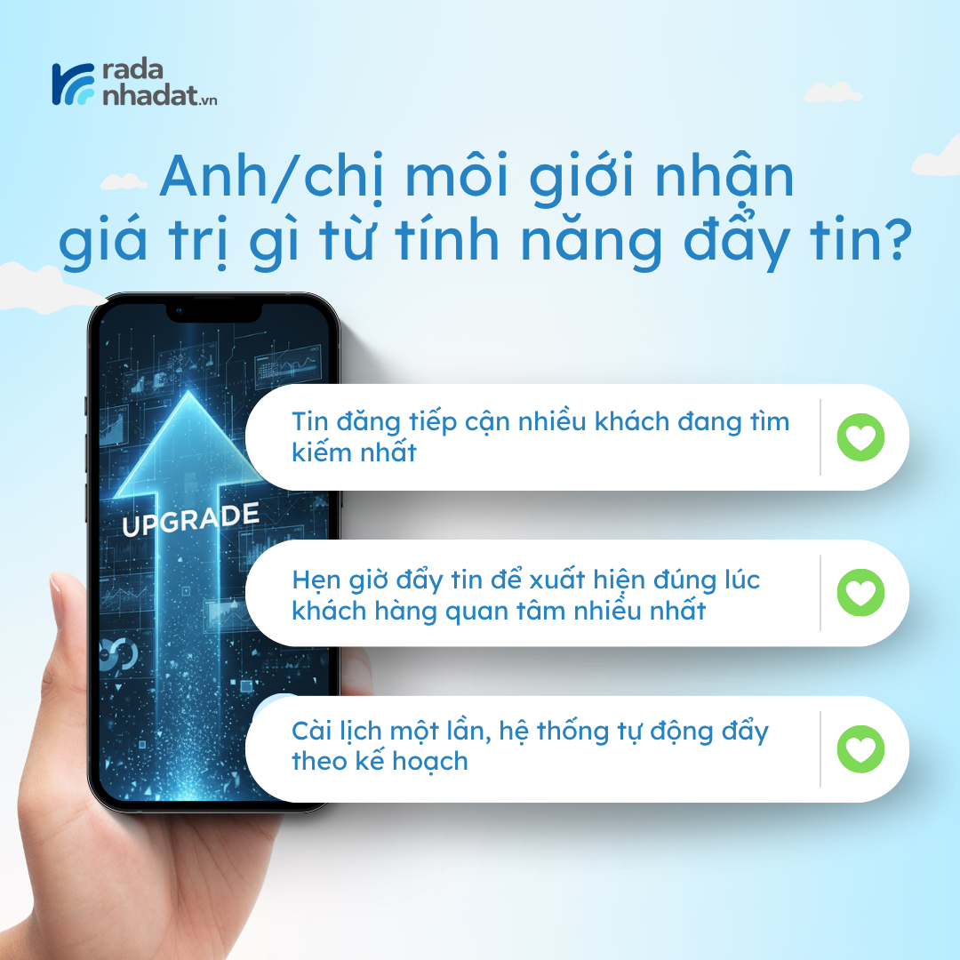 Từ 15/11/2025, Radanhadat.vn cũng ra mắt tính năng “quyền lực” để nâng cấp sân chơi cho môi giới. Thay vì chỉ đăng tin thông thường, môi giới có thể sử dụng tính năng đẩy tin để nâng cao khả năng cạnh tranh, tối ưu thời gian và công sức đăng tin.