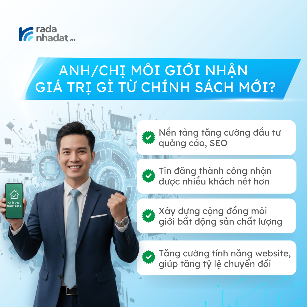 Chính sách mới từ 01/12/2025 là bước tiến để bảo vệ công sức của những môi giới làm nghề tử tế, đồng thời giúp bạn tiếp cận khách thật và bán hàng hiệu quả hơn. Cảm ơn Anh/Chị môi giới đồng hành cùng Radanhadat.vn trong hành trình xây dựng một thị trường BĐS minh bạch, chuyên nghiệp và nhiều cơ hội hơn cho tất cả chúng ta.