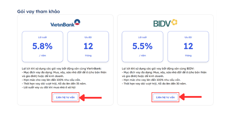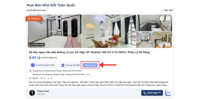 Bước 1: Tại trang tin đăng bất động sản, nhấn “Xem gói vay” (nút màu xanh) bên dưới mỗi tin đăng bất động sản.