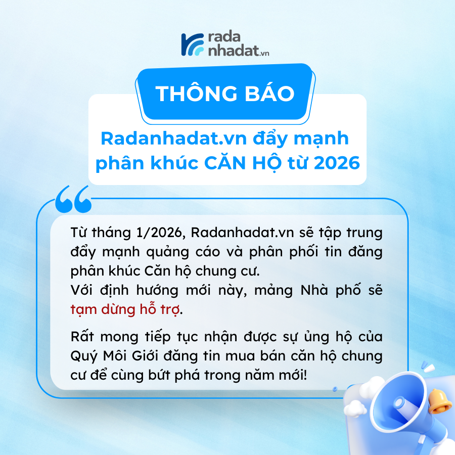 Nhằm phù hợp với định hướng phát triển trong giai đoạn tiếp theo, từ tháng 01/2026, Radanhadat.vn sẽ điều chỉnh phạm vi hoạt động, tập trung vào phân phối vào quảng cáo tin đăng thuộc phân khúc căn hộ chung cư.