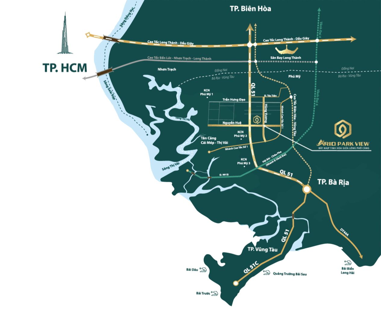 Vị trí của Ario Park View Phú Mỹ là một trong những lợi thế vượt trội, nằm trên mặt tiền đường Hùng Vương, liền kề Quốc lộ 51 và cảng Cái Mép – Thị Vải – một trong những cảng biển đẹp nhất thế giới. Dự án cách TP.HCM khoảng 50km qua cao tốc TP.HCM – Long Thành – Dầu Giây và kết nối dễ dàng đến các khu vực trọng điểm: