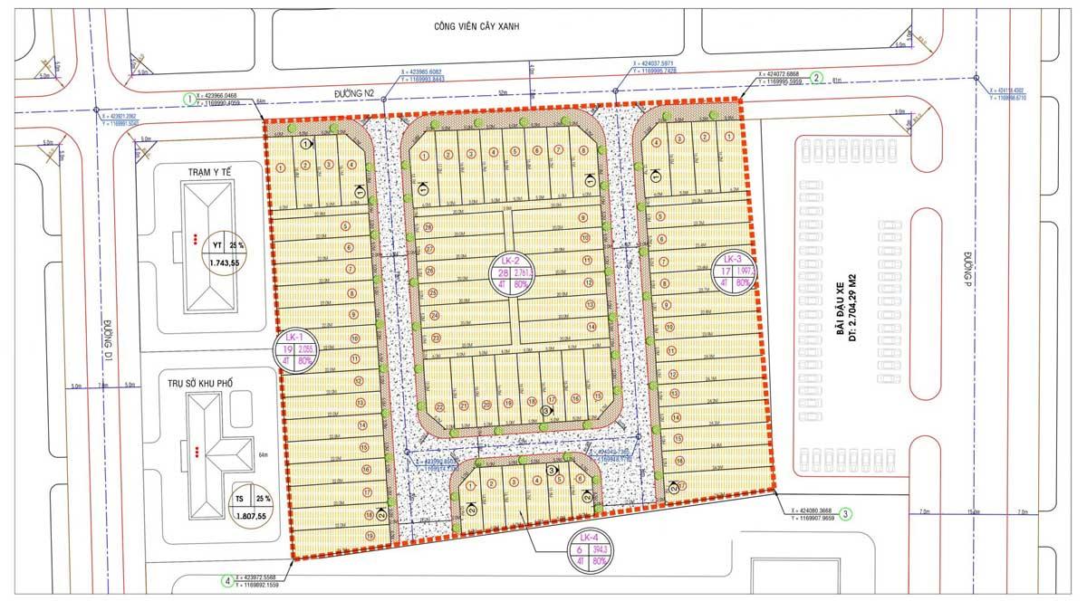 Hạ tầng dự án được đầu tư bài bản, với đường nhựa 12m, điện nước ngầm, vỉa hè, cây xanh và camera an ninh, tạo nên môi trường sống hiện đại và an toàn. Quy hoạch tổng thể chú trọng tối ưu hóa công năng sử dụng, kết hợp không gian xanh và tiện ích công cộng như công viên (9.266m²) và trung tâm y tế (3.550m²).