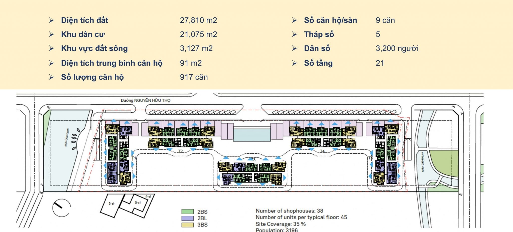 Mặt bằng Celesta Rise Nhà Bè được quy hoạch thông minh trên 5 block cao 20-21 tầng, với tổng diện tích đất 27.810 m². Khu vực tầng trệt dành cho shophouse và tiện ích thương mại, trong khi các tầng trên tập trung vào căn hộ dân cư. Thiết kế đảm bảo mật độ xây dựng thấp, chỉ 9 căn/tầng, tạo không gian thoáng đãng. Phần đất sông 3.127 m² được tận dụng cho view panorama, kết hợp với công viên nội khu để tăng tính thẩm mỹ.