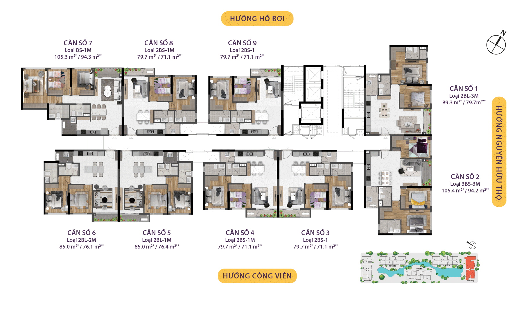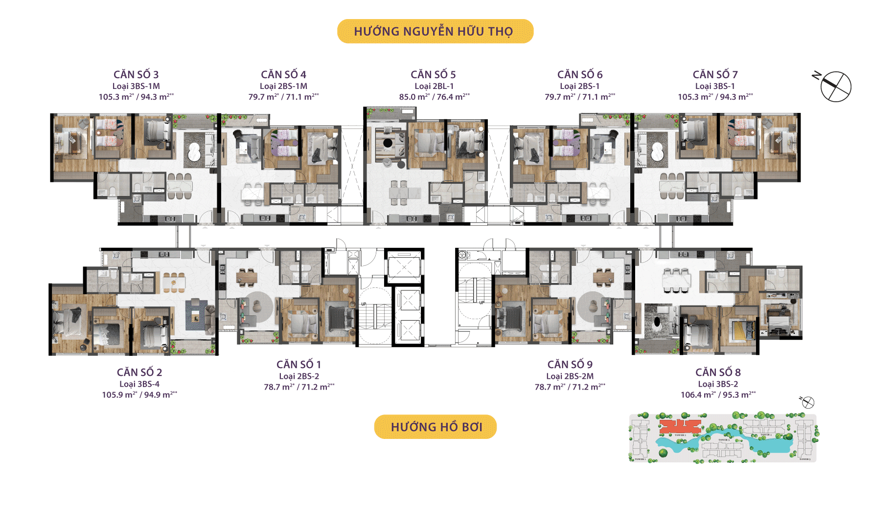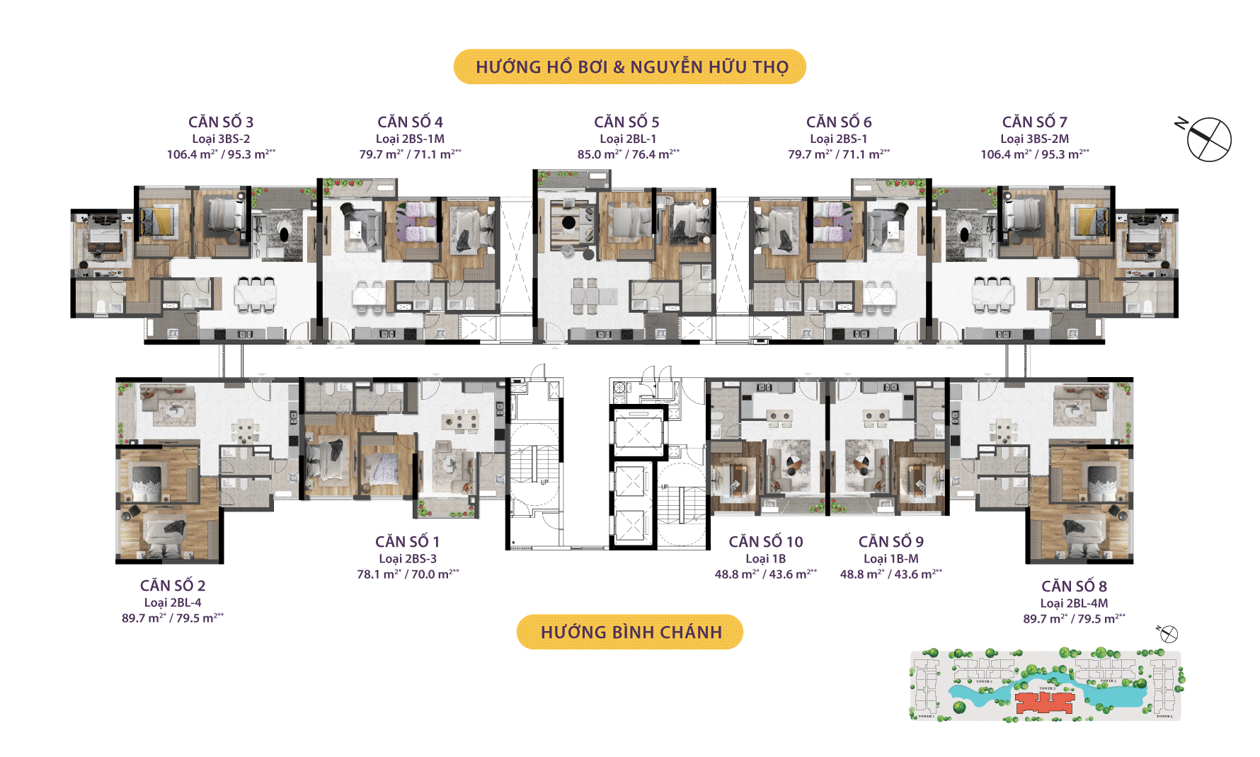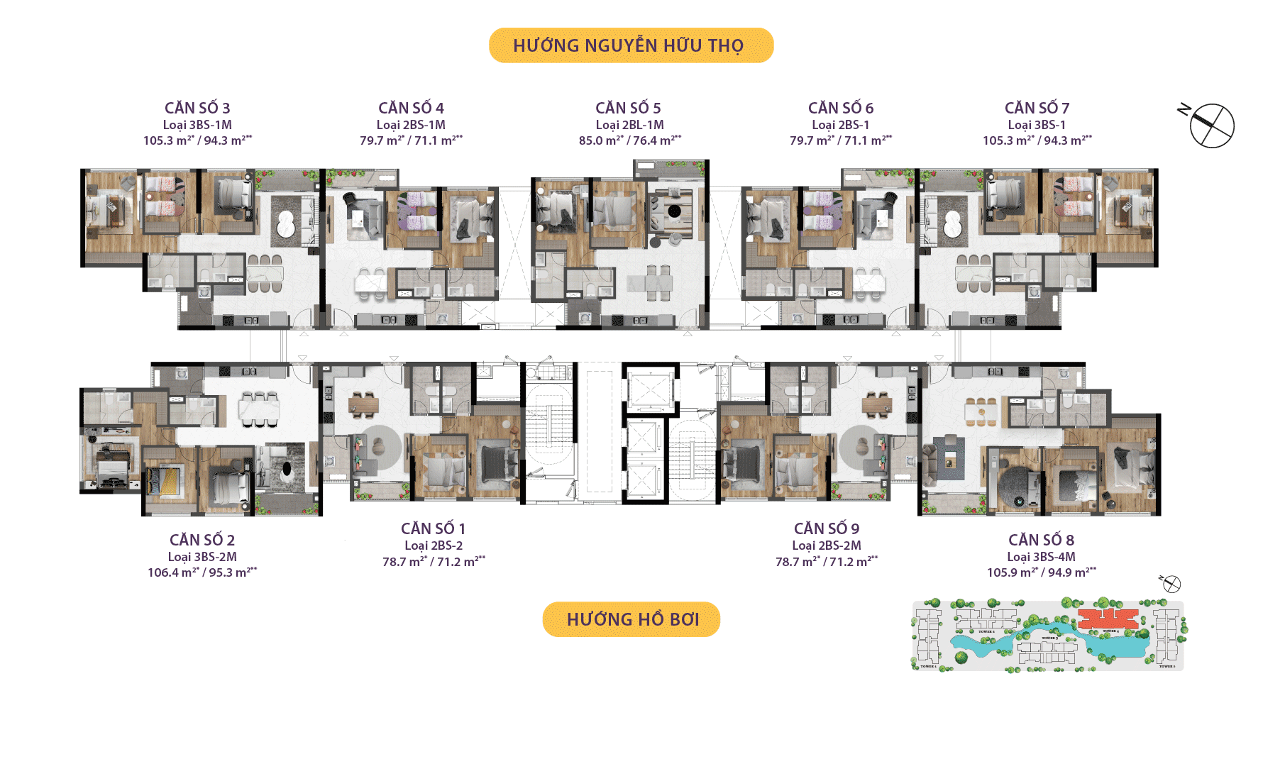 Thiết kế căn hộ tại Celesta Rise Nhà Bè đa dạng, từ 45,3 m² đến 105 m², bao gồm loại 1PN (50 m²), 2PN + 2WC (78-92 m²), 3PN + 2WC (105 m²) và shophouse (145-180 m²). Phong cách bán cổ điển kết hợp yếu tố xanh, đảm bảo mọi phòng đều nhận ánh sáng tự nhiên và view thiên nhiên.