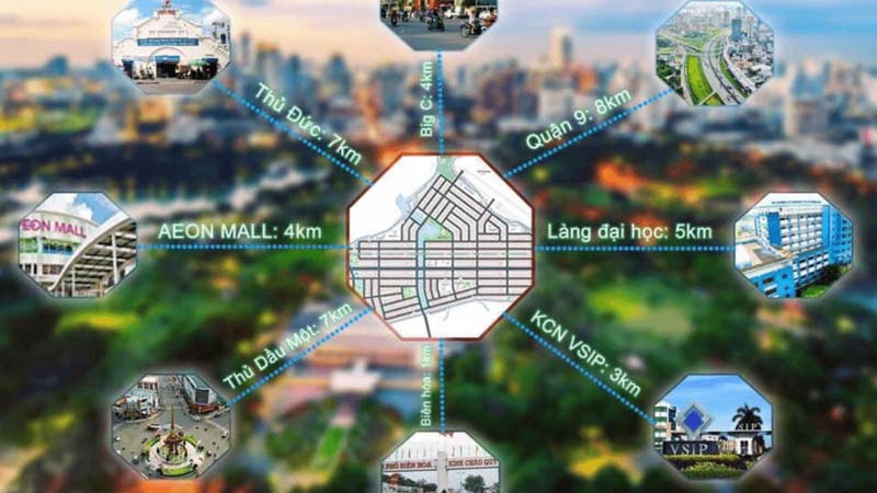 Bốn phía của dự án Đông Bình Dương tiếp giáp với các khu vực dân cư đông đúc và thiên nhiên: