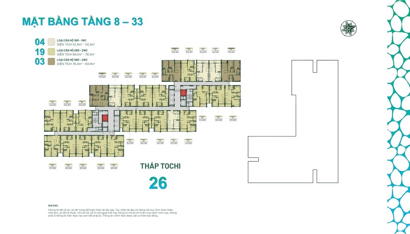 + Căn hộ 1PN +: ~49-55 m² + Căn hộ 2PN-1WC: ~58-59m² + Căn hộ 2PN-2WC: ~69-73 m² + Căn hộ 3PN-2WC: ~85-105 m² + Căn officetel: từ 35-50 m² + Shophouse: từ 80-120 m² |