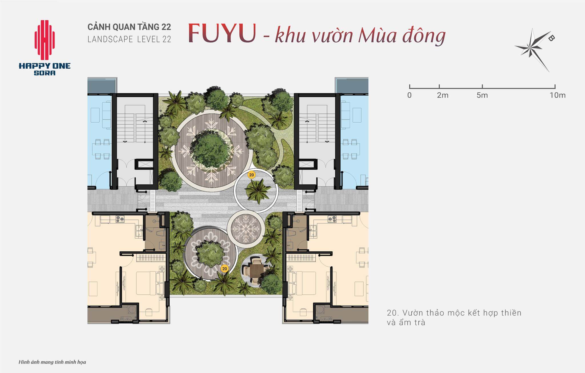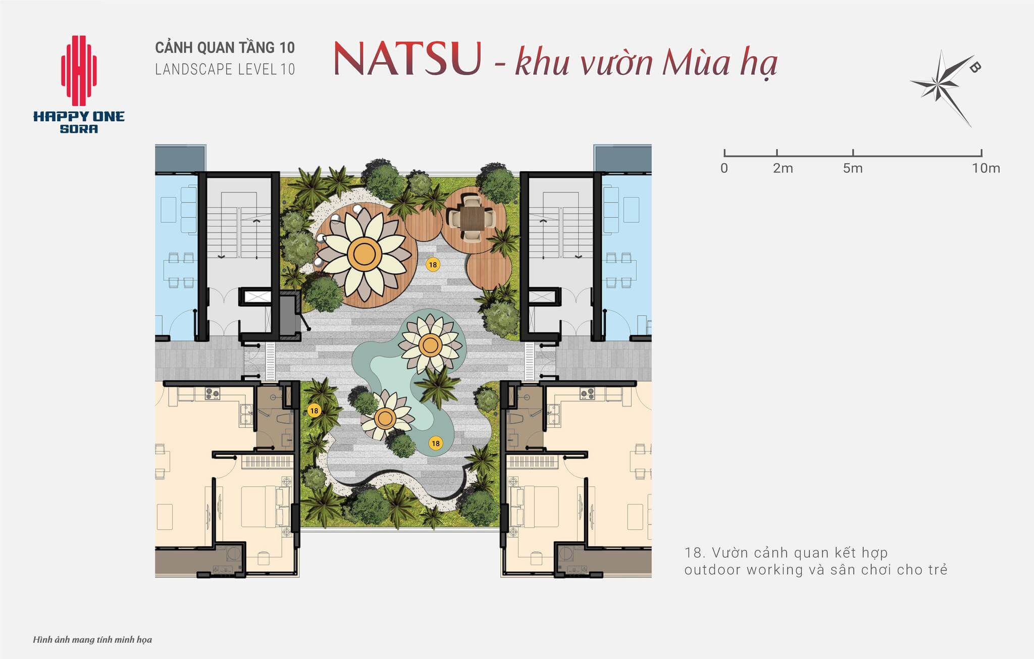 - 4 khu vườn Nhật trên không: Nằm từ tầng 17 đến tầng 24, với các chủ đề khác nhau như vườn thiền, vườn hoa anh đào, vườn đá, và vườn trà đạo, tạo nên không gian xanh độc đáo giữa lưng chừng trời.