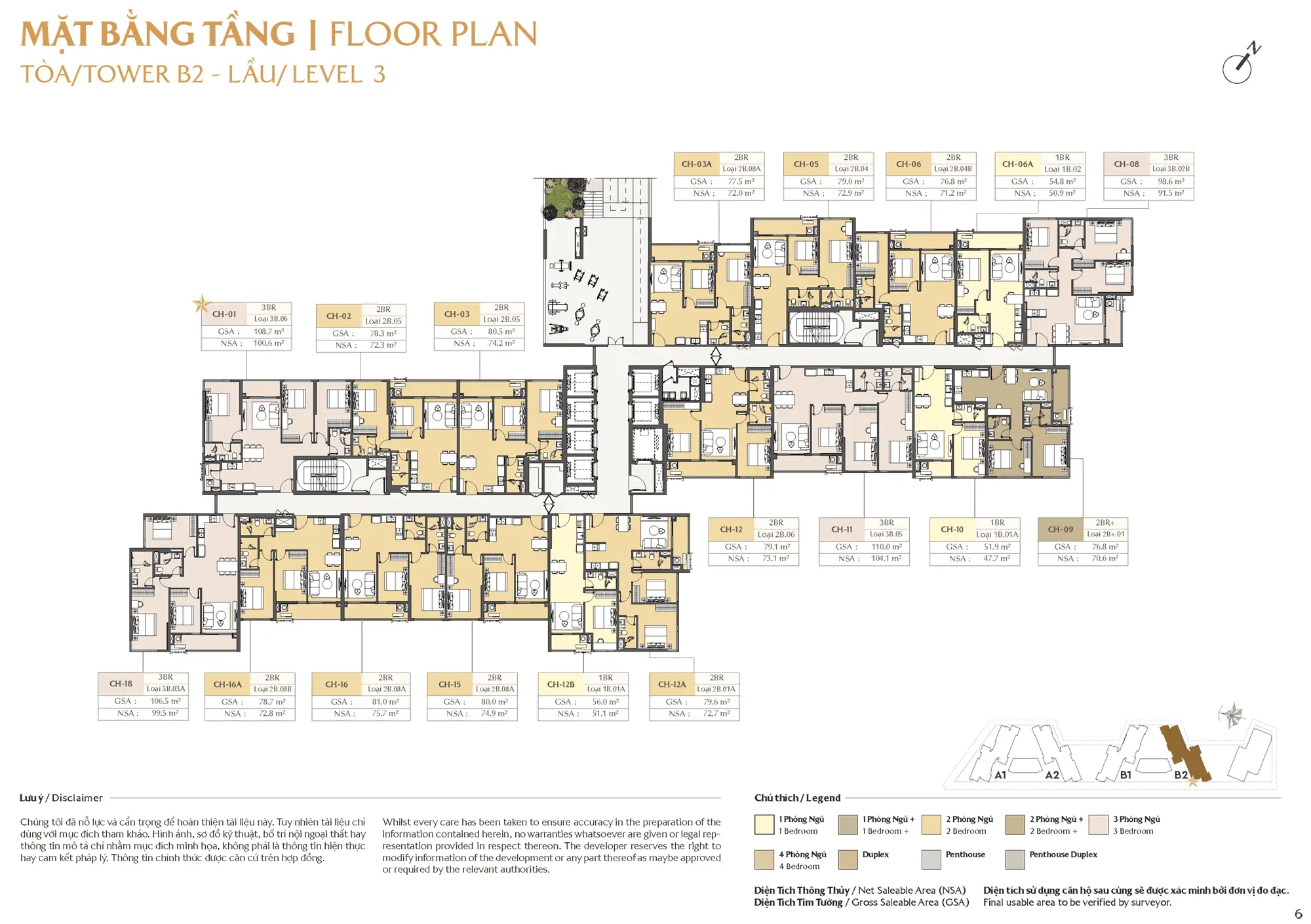 - Căn 3PN (98-110 m²) và 4PN (128-135 m²) lý tưởng cho gia đình lớn, với phòng master rộng rãi có jacuzzi riêng và thiết kế thông tầng cho duplex (128,9 m² kết nối 2 tầng).