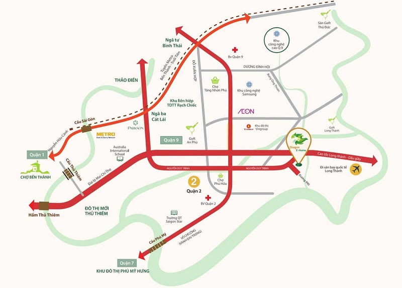- Vị trí chiến lược: Dự án tọa lạc ngay trong khu đô thị Dragon City, khu vực trung tâm của Quận 9 (Thành phố Thủ Đức). Đây là nơi quy tụ đông đảo cư dân trí thức, văn minh. Hạ tầng khu vực cũng đang phát triển mạnh mẽ với các tuyến giao thông trọng điểm như cao tốc Long Thành – Dầu Giây, tuyến Metro số 1 (Bến Thành – Suối Tiên)…, giúp kết nối thuận tiện đến trung tâm và các khu vực lân cận.