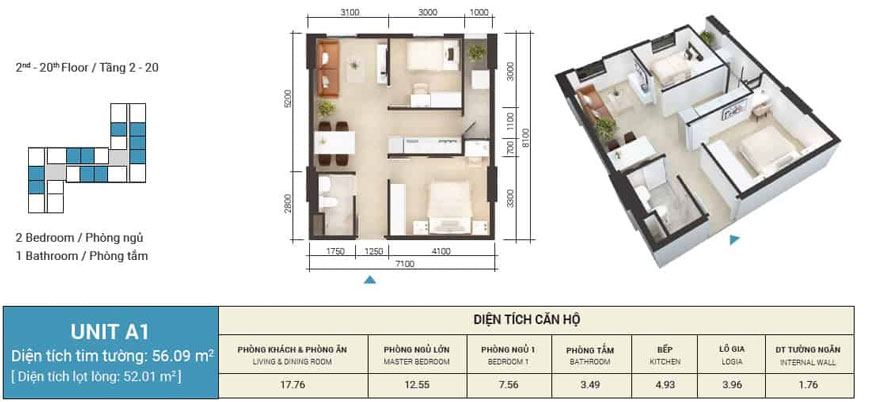 - Căn 2PN 56m²: phòng khách & ăn 17.6m², phòng ngủ lớn 12.55m², phòng ngủ nhỏ 7.65m², phòng tắm 3.49m², bếp 4.93m² và logia 3.96m²