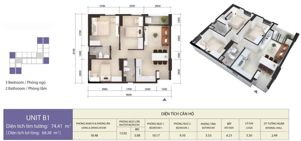 - Căn 3PN 74m²: phòng khách & ăn 18.48m², phòng ngủ lớn 12.02m² kèm WC 3.08m², hai phòng ngủ nhỏ 10.17m² và 9.10m², phòng tắm 3.53m², bếp 6.21m², logia 3.3m²