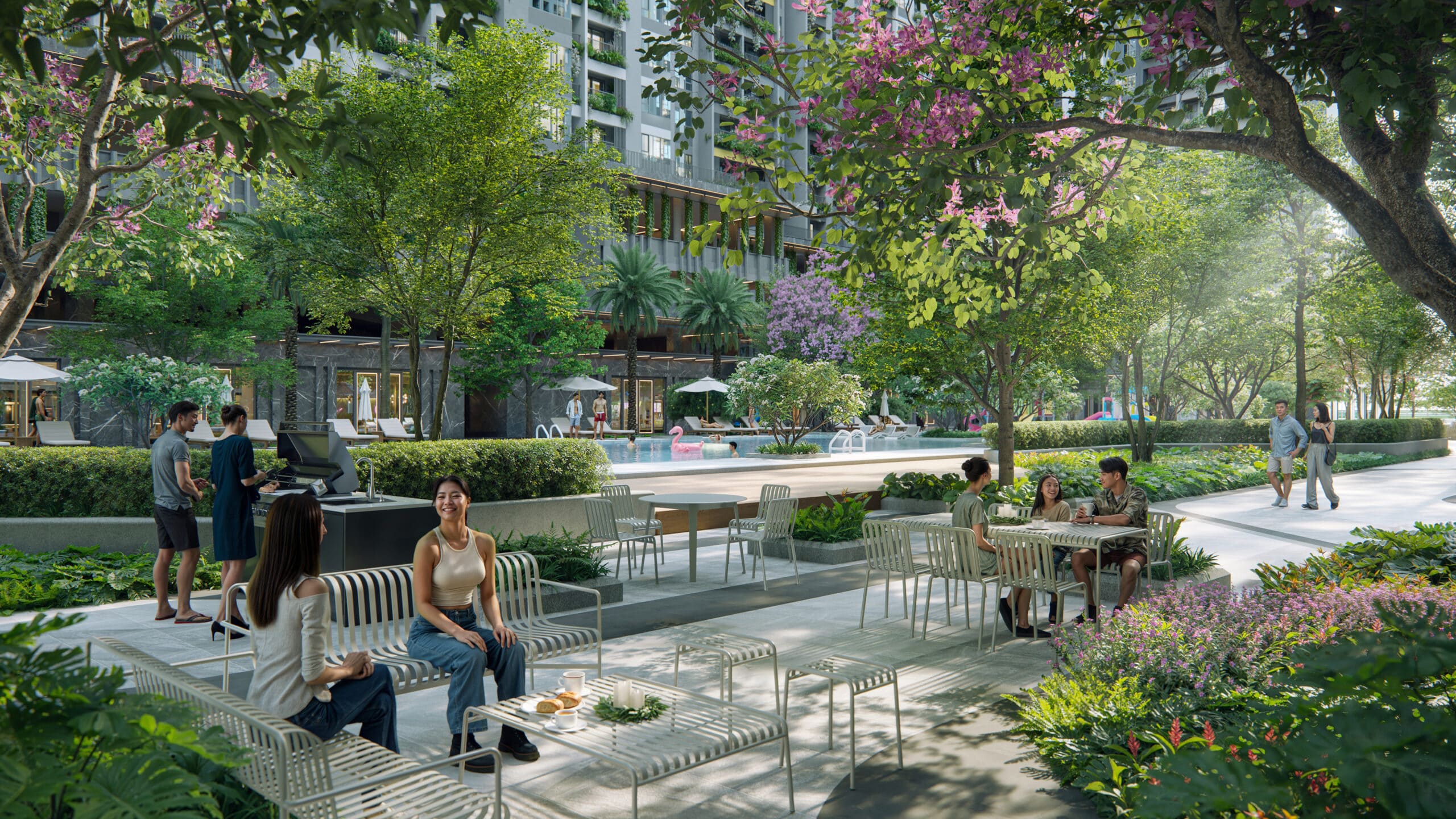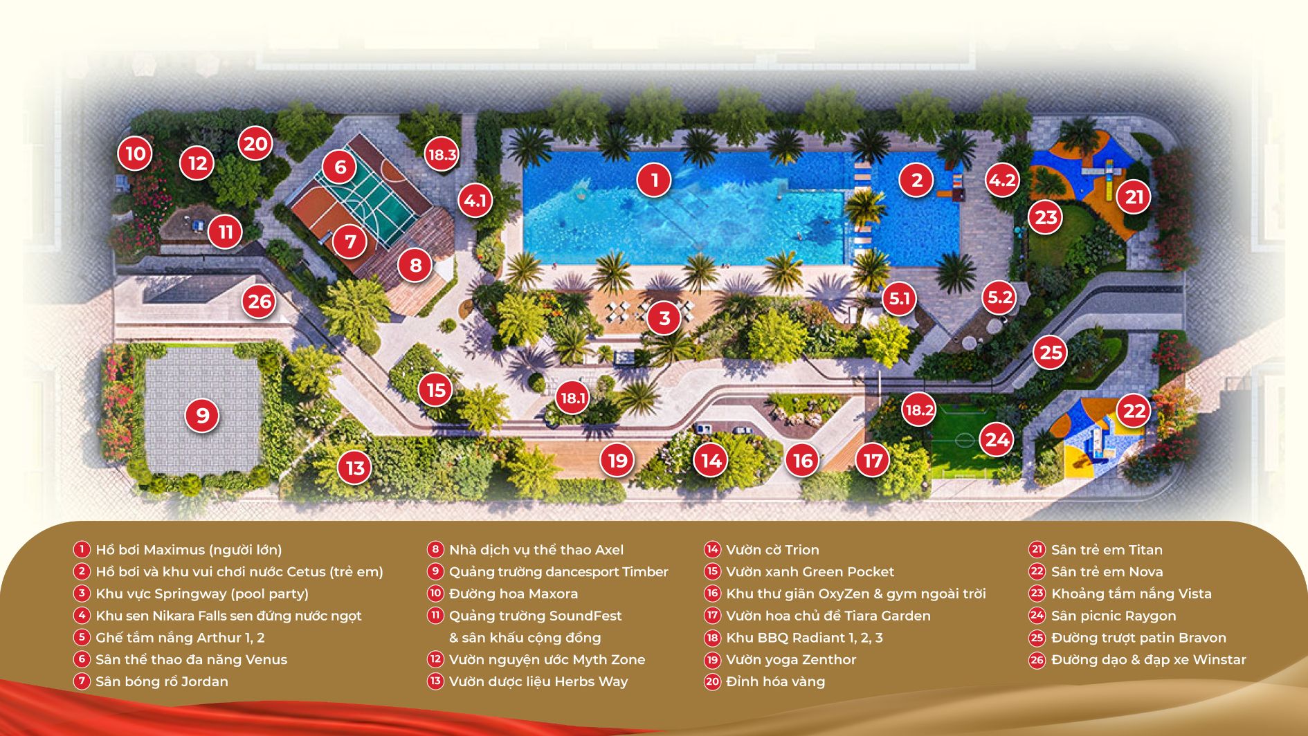 - Không gian thư giãn và cộng đồng: Vườn xanh Green Pocket, Khu thư giãn OxyZen, Vườn hoa Tiara Garden và Khu BBQ Radiant.