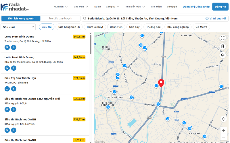 Để đưa ra quyết định chính xác và an tâm khi chọn nơi an cư, công cụ Khám phá khu vực của Radanhadat.vn sẽ là trợ thủ đắc lực. Chỉ cần nhập vị trí của bạn, hệ thống sẽ ngay lập tức hiển thị khoảng cách đến siêu thị, bệnh viện, trường học và các tiện ích quan trọng khác xung quanh, giúp bạn dễ dàng đánh giá và lựa chọn nơi sống phù hợp nhu cầu.