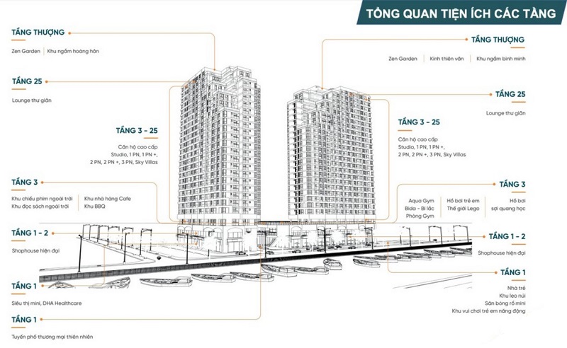 + Tầng 1 – Shophouse, SHCĐ, Sảnh, Hồ bơi, Tiện ích chung và Bãi Đậu Xe + Tầng 2 & 3 – Shophouse, SHCĐ, Office + Tầng 4 – SHCĐ, Tiện ích chung + Tầng 5 – trở lên là Căn Hộ |