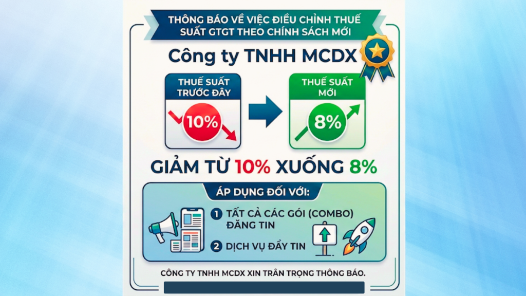 Căn cứ vào Nghị định 174/2025/NĐ-CP về việc giảm thuế suất thuế giá trị gia tăng (GTGT), Công ty TNHH MCDX xin trân trọng thông báo về việc điều chỉnh mức thuế suất GTGT như sau: