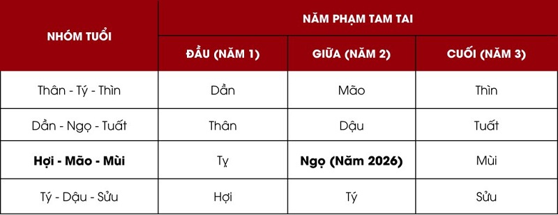 Năm 2026 theo âm lịch là năm Bính Ngọ, có Thiên Can Bính và Địa Chi Ngọ. Dựa theo quy luật tính Tam Tai ở phần trên, ta biết rằng: Nhóm tuổi Hợi – Mão – Mùi sẽ gặp hạn Tam Tai vào ba năm Tỵ, Ngọ và Mùi.
